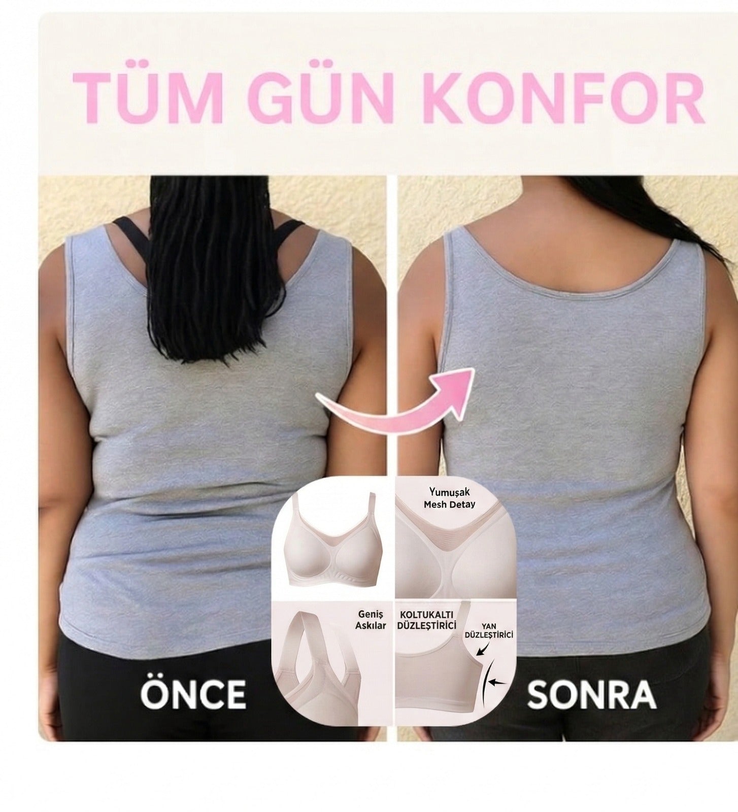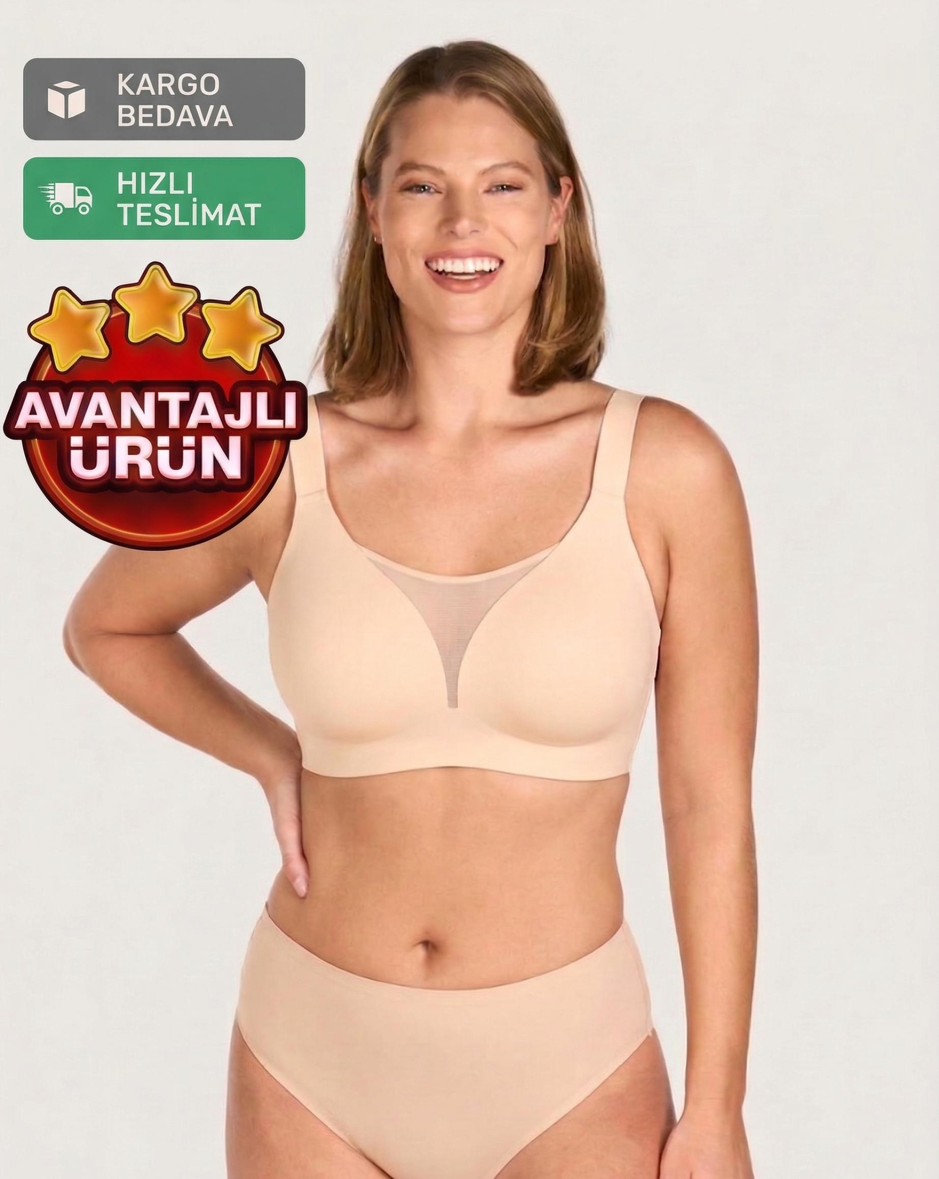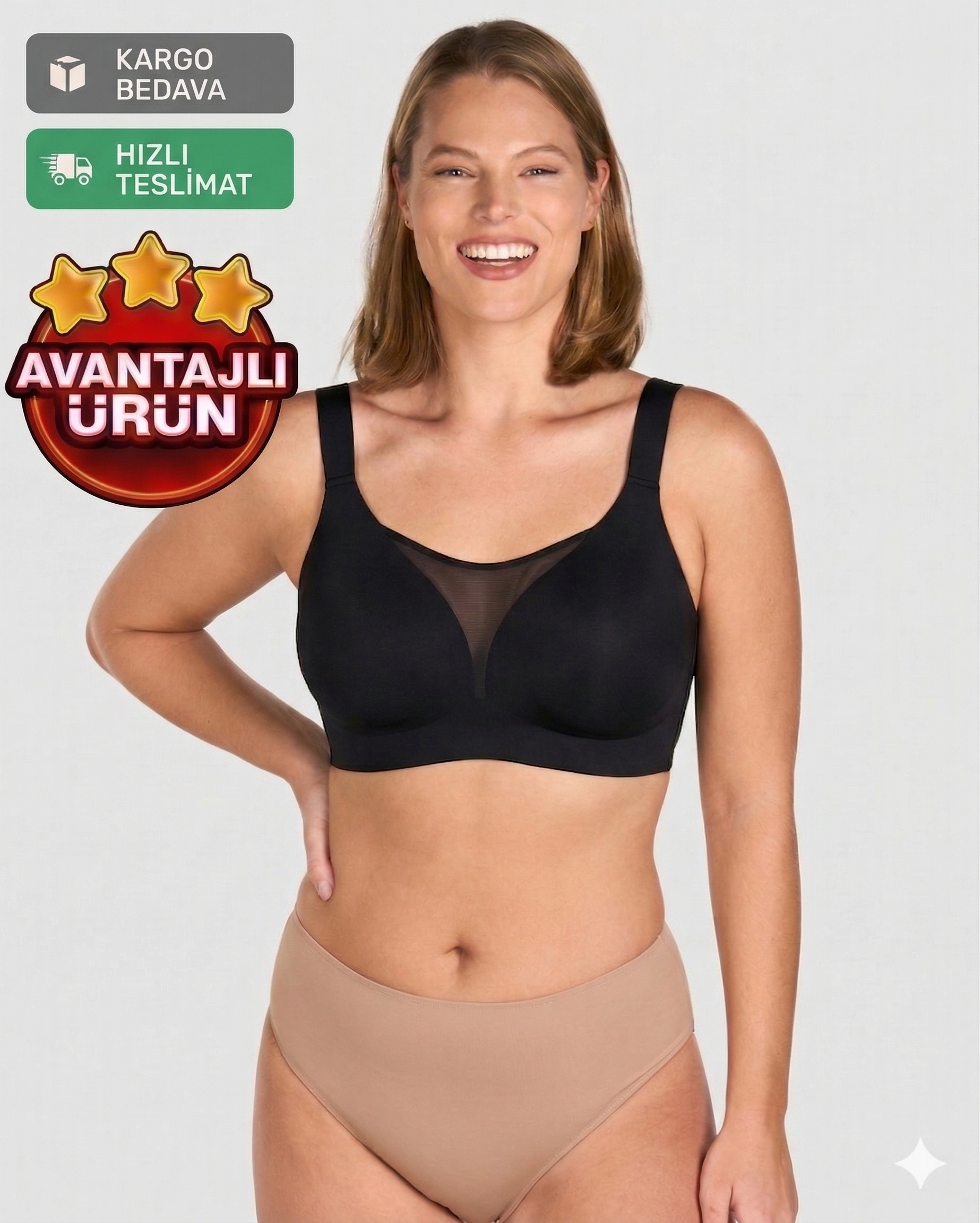 Almirana’nın toparlayıcı sütyeni ise göğüsleri nazikçe yukarı alır, dengeler ve daha küçük, daha orantılı bir görünüm sağlar. Üstelik sıkmadan ve iz yapmadan gün boyu konfor sunar.