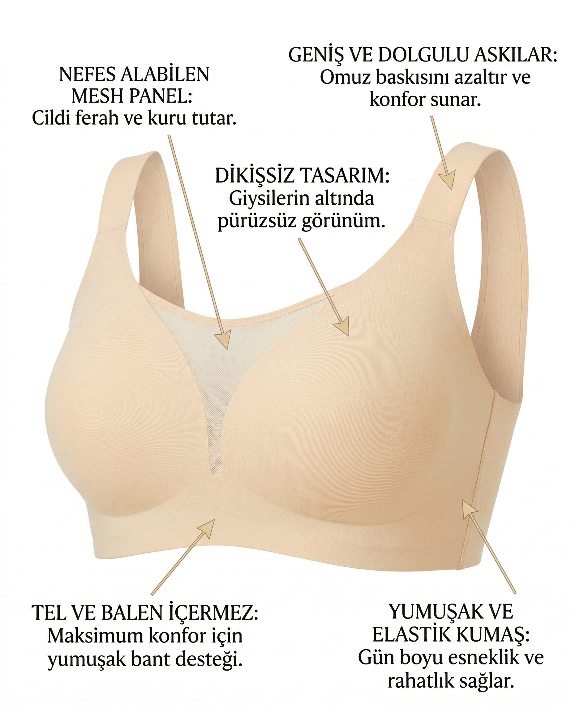 Almirana süzen sütyen, geniş askı yapısıyla sırtınızı sıkmadan destek sunar. Gün boyu rahatlık sağlarken, pürüzsüz ve toparlayıcı etkisiyle kıyafetlerinizin altında kusursuz bir görünüm oluşturur. Konforu keşfetmek için şimdi deneyin!
